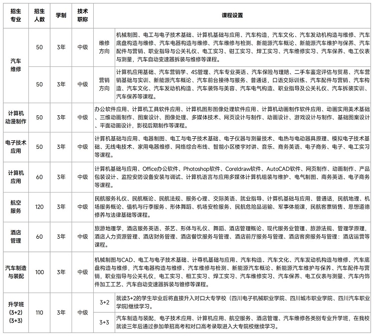 開設專業有:汽車制造與裝配、汽車維修、數控加工、計算機應用與維修、計算機動畫制作、電子技術應用、航空服務、酒店管理等專業。