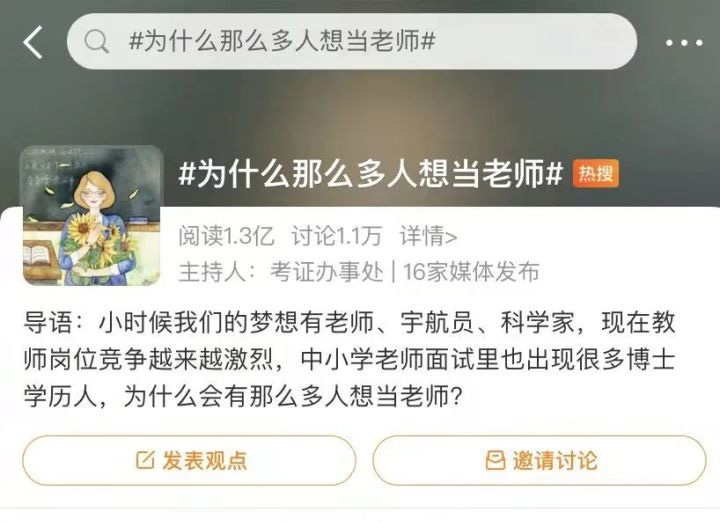 這個熱門話題有上億人閱讀、上萬人參與討論。據今年教育部公布的最新數據:“全國教師規模不斷擴大,根據最新統計數據顯示,教師總數已經達到1792.97萬人,比上年增加60.94萬人,增長3.52%”。