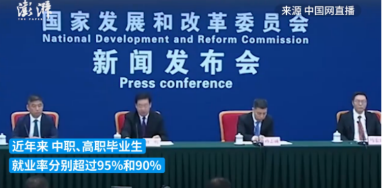 但與此同時,在6月13日,國家發改委專題新聞發布會也發布了一組就業數據,根據國家發改委社會司司長劉明的介紹,近年來中國的中職高職畢業生,就業率分別達到了95%和90%。